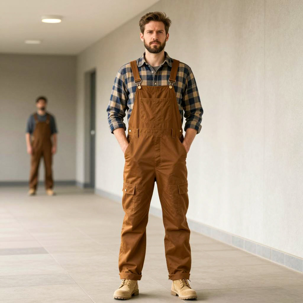 Photorealistic image of a man with short brown hair and a beard standing in a modern building hallway. He is wearing brown overalls over a plaid shirt and beige boots, with his hands in his pockets and a serious expression. The setting features a neutral background with tile flooring, soft lighting, and two white light fixtures on the ceiling. Another person dressed similarly is blurred in the distance.