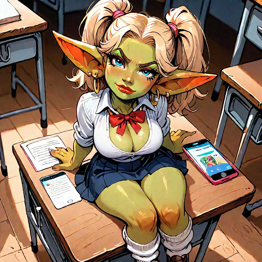 Score_9, score_8_up, score_7_up, score_6_up, score_5_up, rating_explicit, source_anime, solo, (female goblin:1.3), cute face, (cute:1.2), short, (shortstack:1.3), large breasts, wide hips, big ass, school uniform, short skirt, loose socks, shoes, jewelry, blonde hair, twintails, cleavage, classroom, sitting on desk, holding phone, looking up at viewer, loose neck ribbon, head tilt, hoop earings, grumpy, bratty, high angle shot