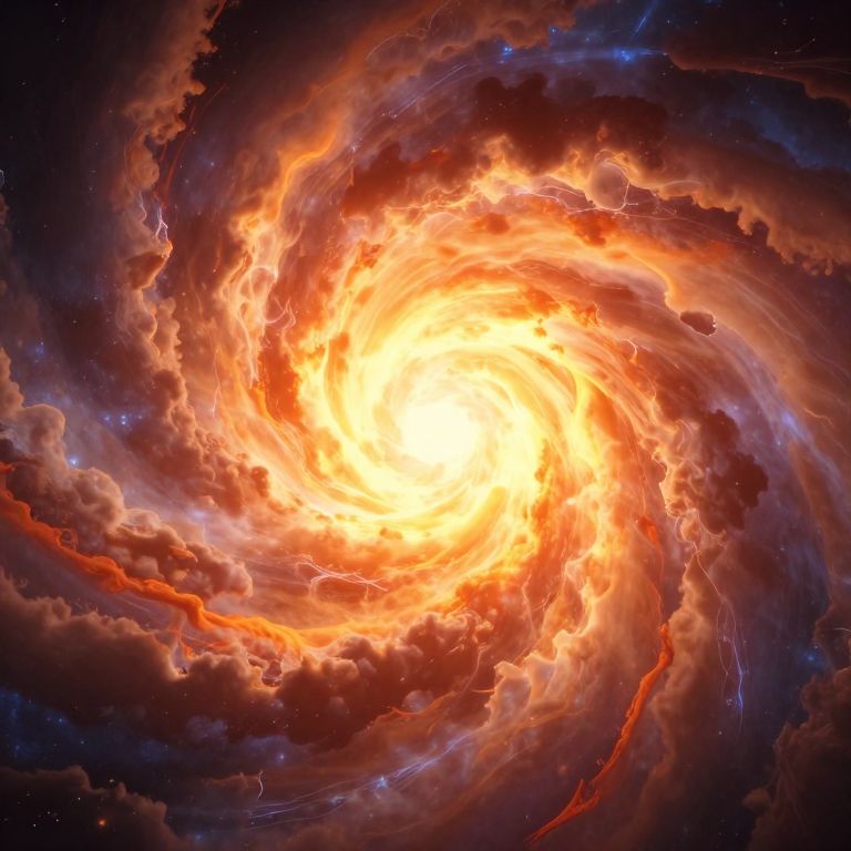 Digital artwork of a vibrant, swirling cosmic vortex with a bright, fiery yellow-orange core surrounded by dynamic, glowing red and orange clouds and dark, star