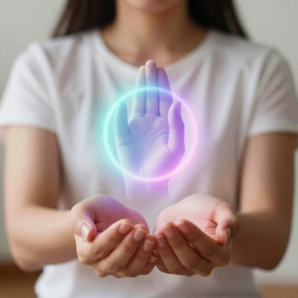 Close-up of hands emitting reiki colors in a calm setting, gentle shades of turquoise, lavender, and pink illuminating the air, symbolizing energy transfer and healing