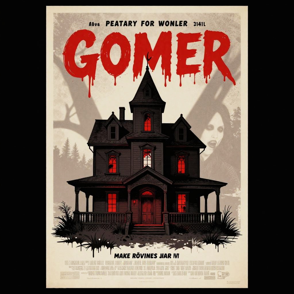 Horror movie poster for "A Haunting for Wonder: The House of GOMER." Features a dark, eerie house with glowing red windows and