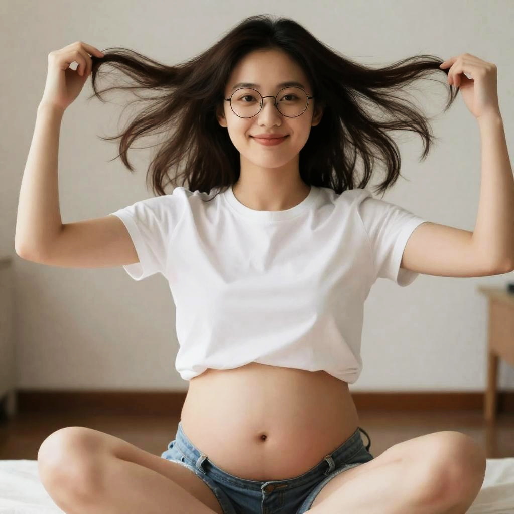 (8k, RAW photo, best quality, masterpiece:1.2), (realistic, photo-realistic:1.37), ((1girl)), portrait, float hair, professional lighting, photon mapping, radiosity, physically-based rendering, lens 135mm, f1.8, close-up, looking at viewer, round eyewear, glasses, smile, short white t-shirt, Mini Shorts, 20 year old woman, beautiful lips, beautiful smile, full body, indoors, belly, show belly, arms up, sitting, head out of frame