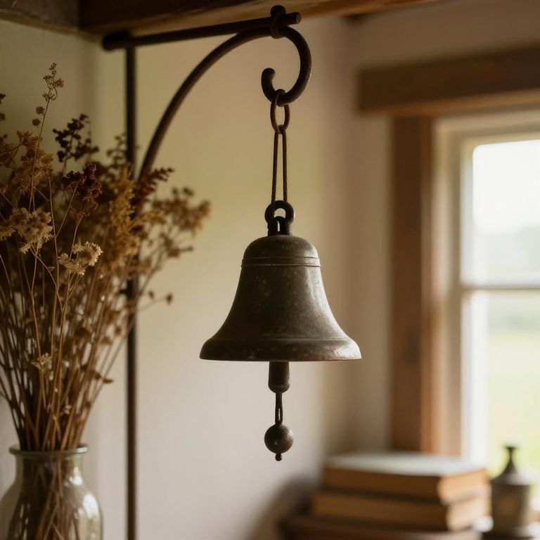Vintage handbell hanging on a wrought iron hook in a quaint countryside cottage, surrounded by dried flowers and old books, warm natural light highlighting the rustic charm and nostalgic atmosphere, soft focus background