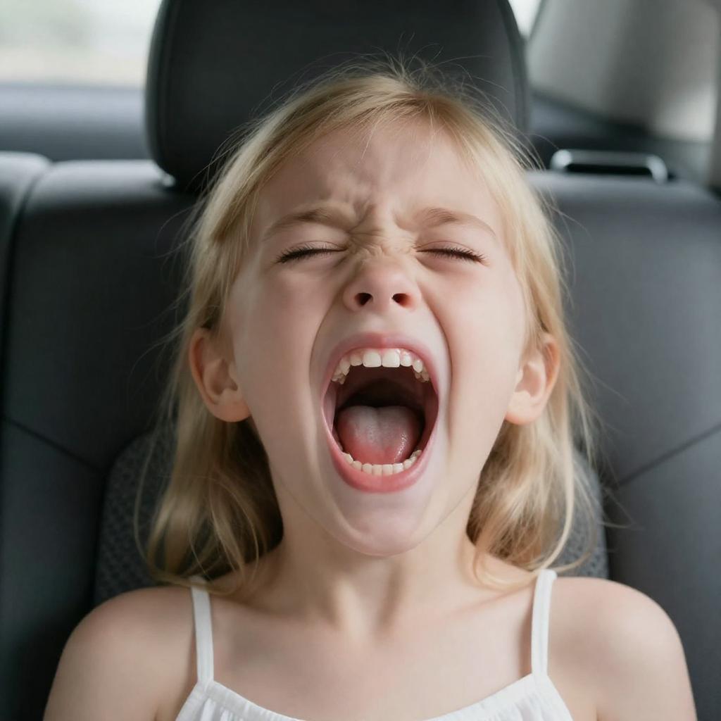 Photograph of a young blonde girl with fair skin, eyes closed, mouth wide open in a scream, seated in the backseat of a car. Grey patterned headrests in background. Upper back visible. Emotional intensity.