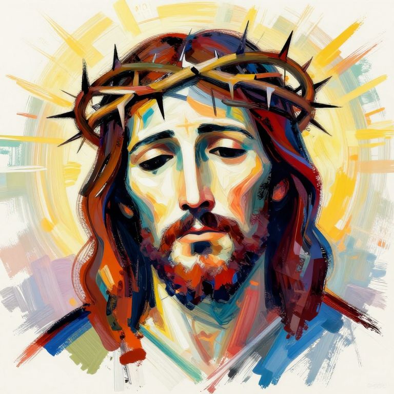 JesusDrawing in a contemporary abstract style, focusing on expressive brush strokes and vivid colors, portraying a compassionate face with a crown of thorns subtly integrated into swirling patterns, set against a dynamic, textured background with spiritual symbolism.