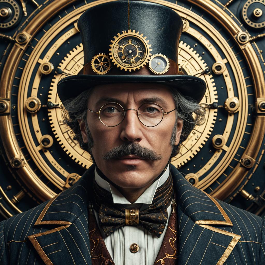 Full body portrait of a male juggler dressed in vintage carnival attire including a top hat, striped colorful jacket, and bow tie, performing on a rain-soaked street. The scene features colorful festoon lights and balloons overhead, illuminated carnival signs, and wet reflective pavement. The background has an atmospheric blend of surrealism and cubist art elements with people in period clothing milling about under theatrical lighting.