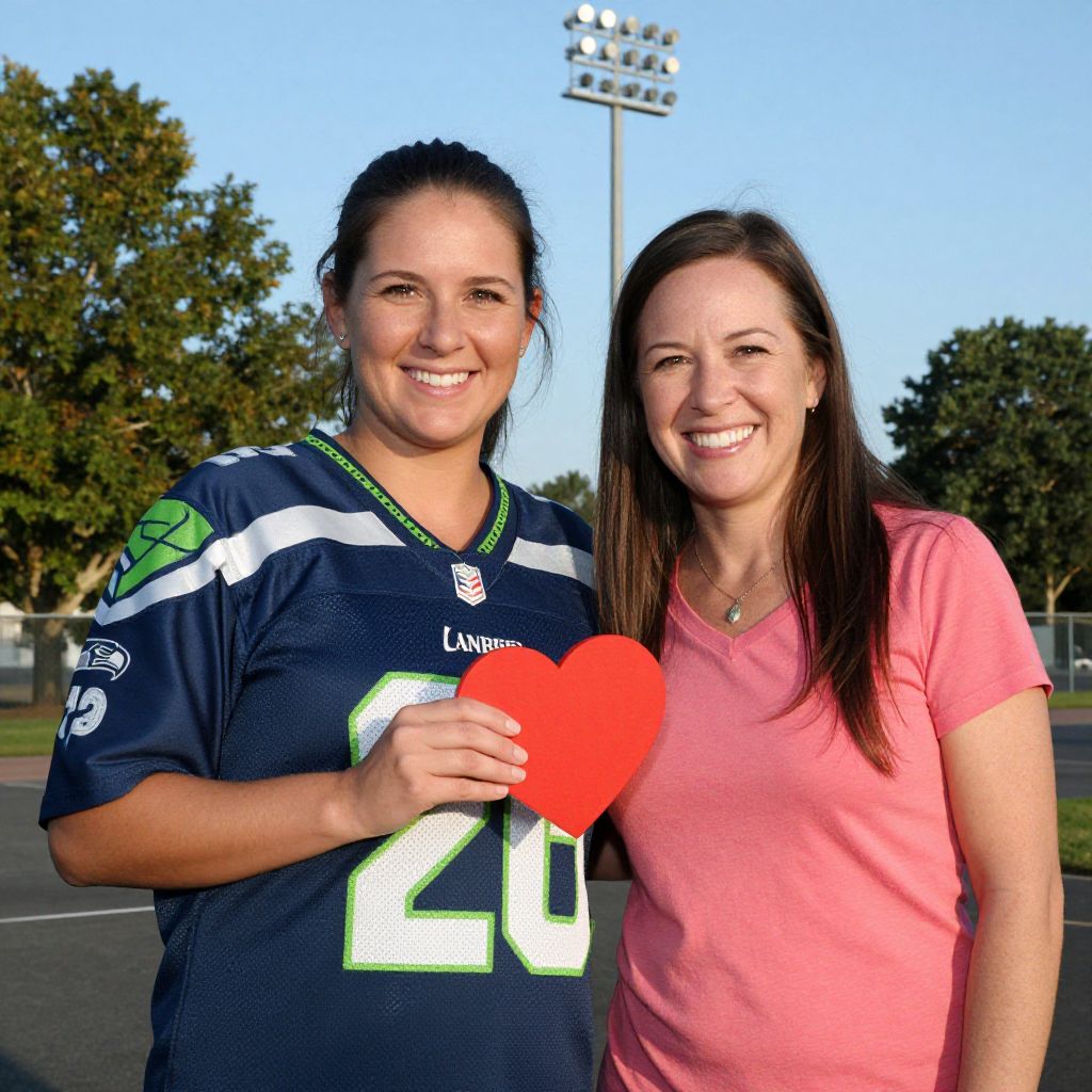 Photograph of a smiling brunette woman in a Seattle Seahawks jersey holding a red heart, standing next to a brunette woman in a pink shirt on a sunny