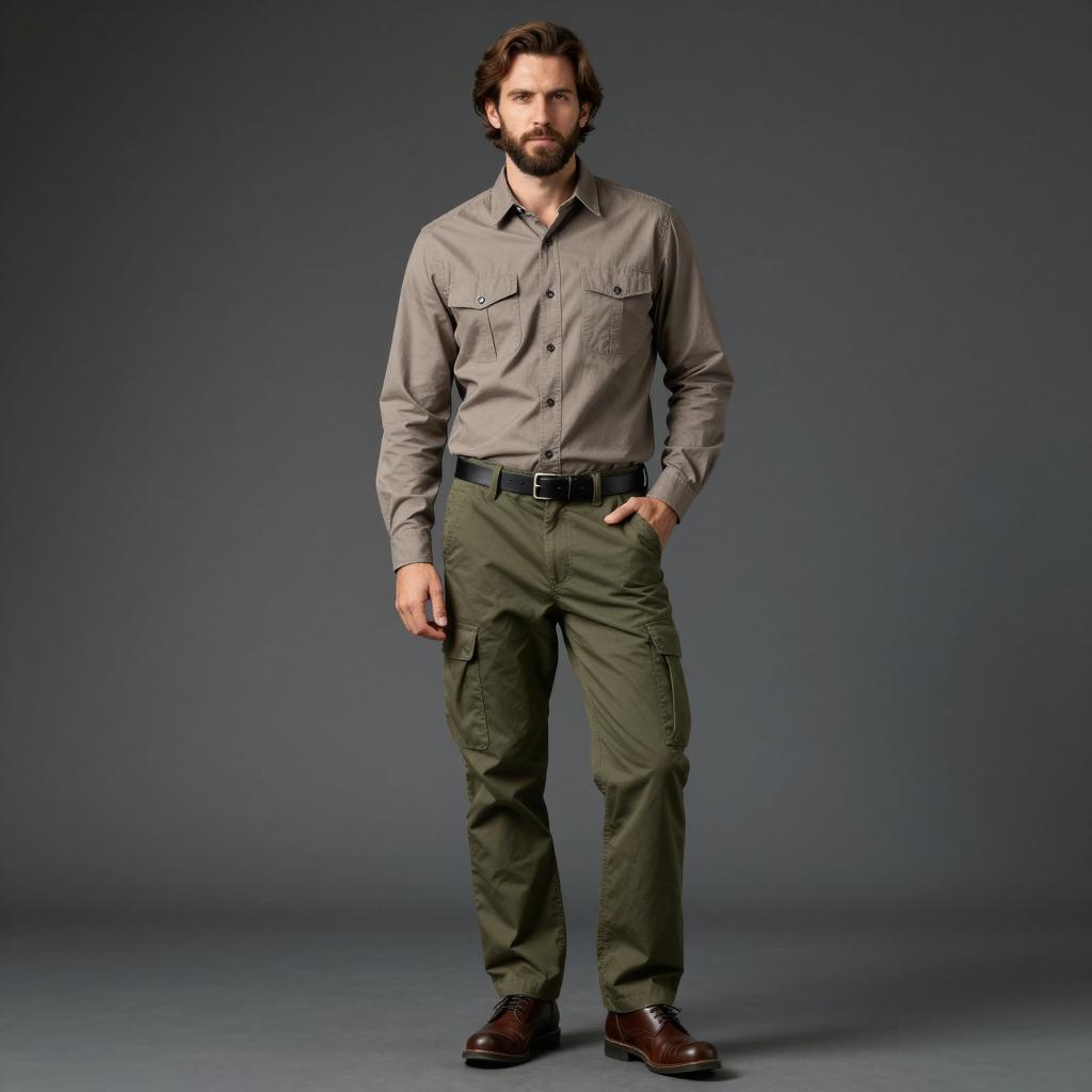 Shirtless Man Wearing Olive Cargo Shorts with Backpack