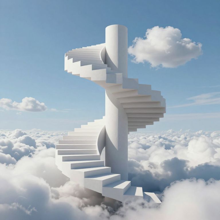 A surreal 3D-rendered staircase spirals upward into the clouds, its steps appearing to float and shift unpredictably, evoking a dreamlike, high-definition visual effect reminiscent of M.C. Escher's impossible structures.