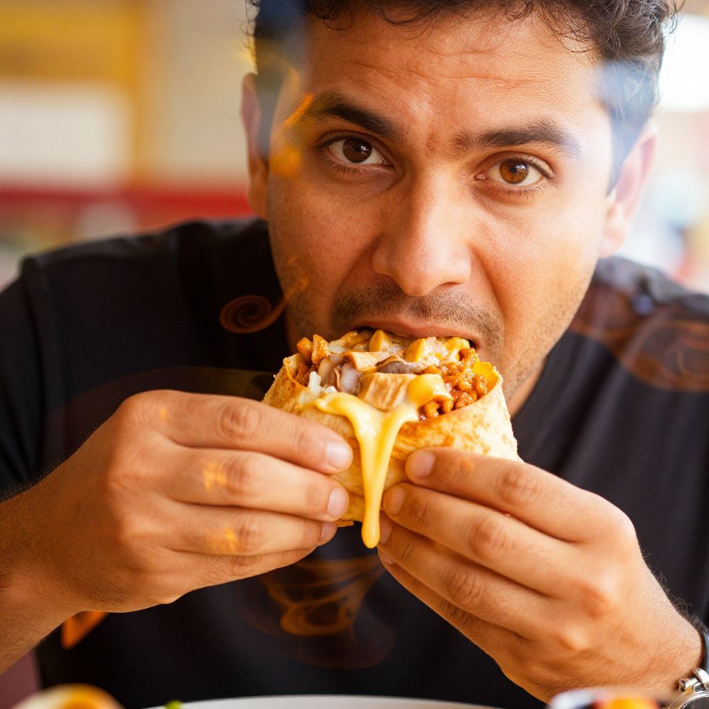 Photograph of a man with dark curly hair and brown eyes, mid-bite into a cheeseburger, wearing a black shirt, with a blurred background