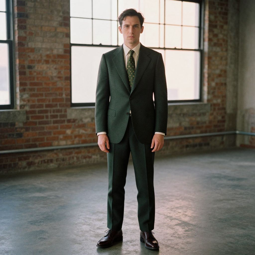 A man, dark green suit, cream dress shirt, patterned green tie, dark brown leather brogues, industrial loft space, exposed brick, soft golden hour light, confident expression, kodacolor analog film. Man has masculine face and piercing eyes