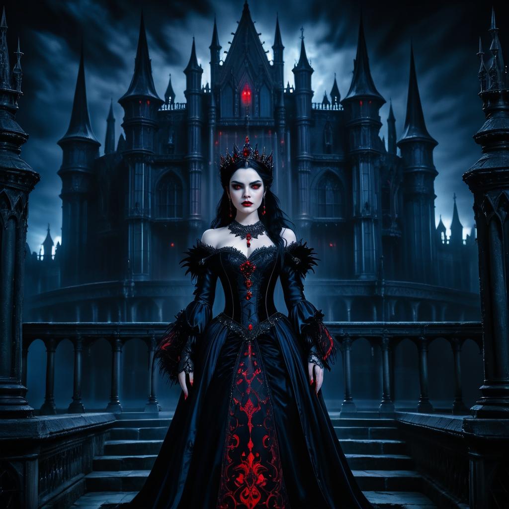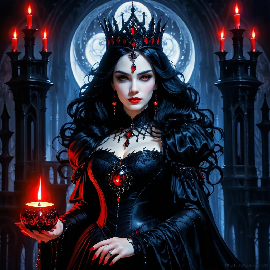 A gothic painting of a dark sorceress with piercing red eyes dressed in an ornate black gown. She wears a majestic crown adorned with red gems and holds black candelabras with glowing red candles. The background features a dark, spired castle under a full moon, illuminated by eerie candlelight with rich and vibrant colors in a dark fantasy style.