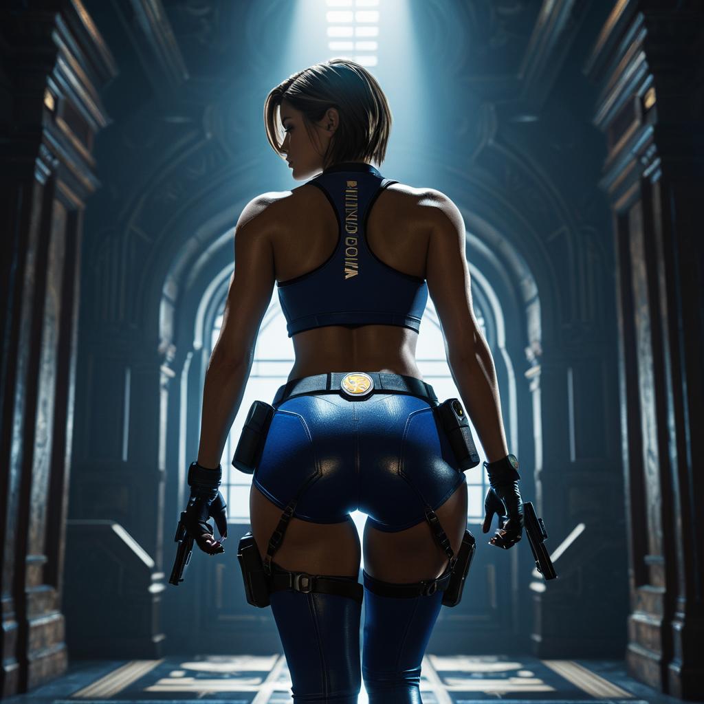Back view of Jaina Proudmoore from World of Warcraft, with hyper-real shiny skin on midriff, thighs, and calves, Dogecoin logo on back. Photorealistic fantasy style with backlighting, rim light, silhouette, intricate details, smooth fine art rendering, 8k octane, 70mm lens, cinematic lighting.
