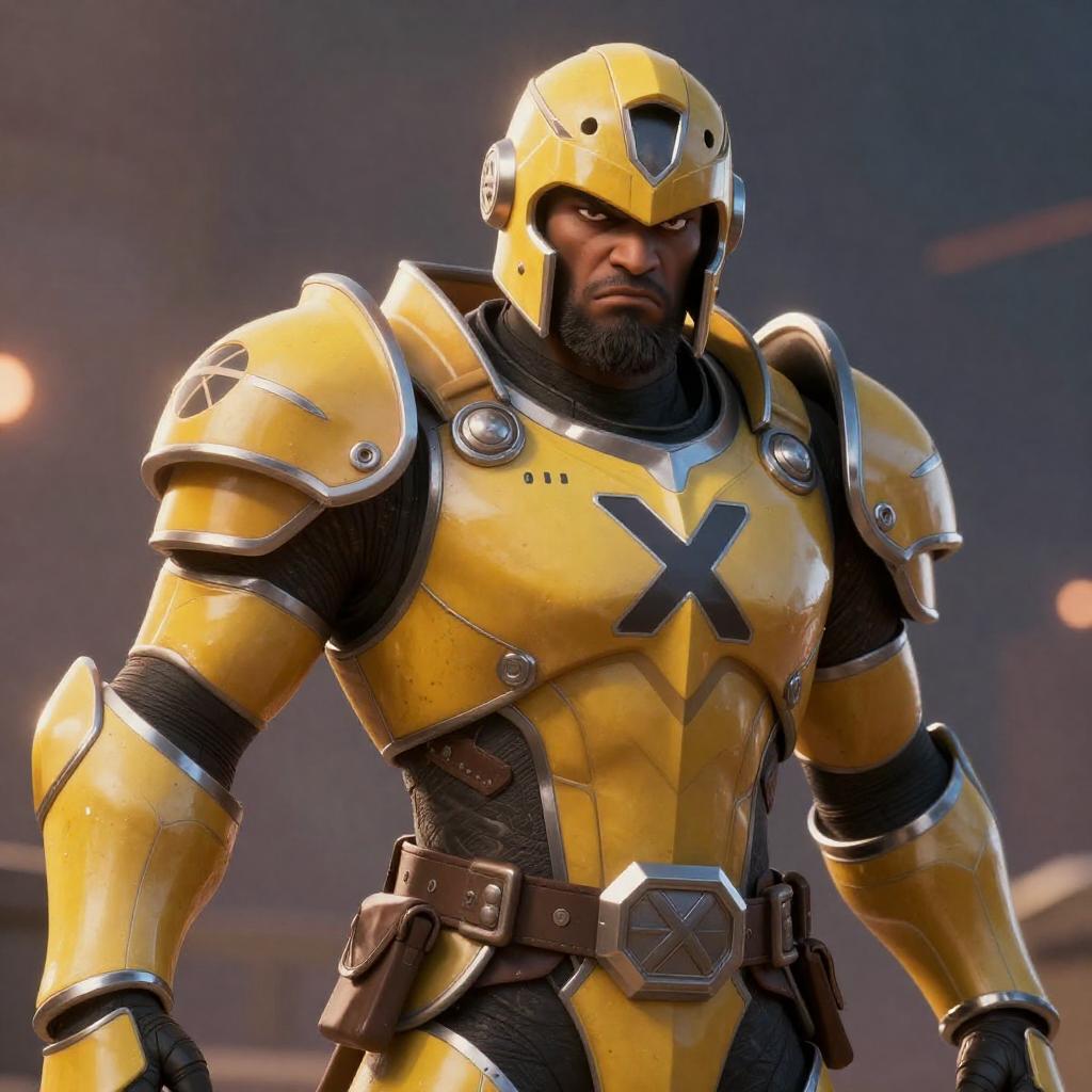 3D rendered image of a grumpy Ivorian male character wearing detailed yellow plate armor and helmet, featuring an X symbol on the chest. The character has a strong, manly appearance with a beard, captured at dusk with lens flare effects and high realism. The armor includes brown pouches and intricate metallic detailing, set against a softly blurred background.
