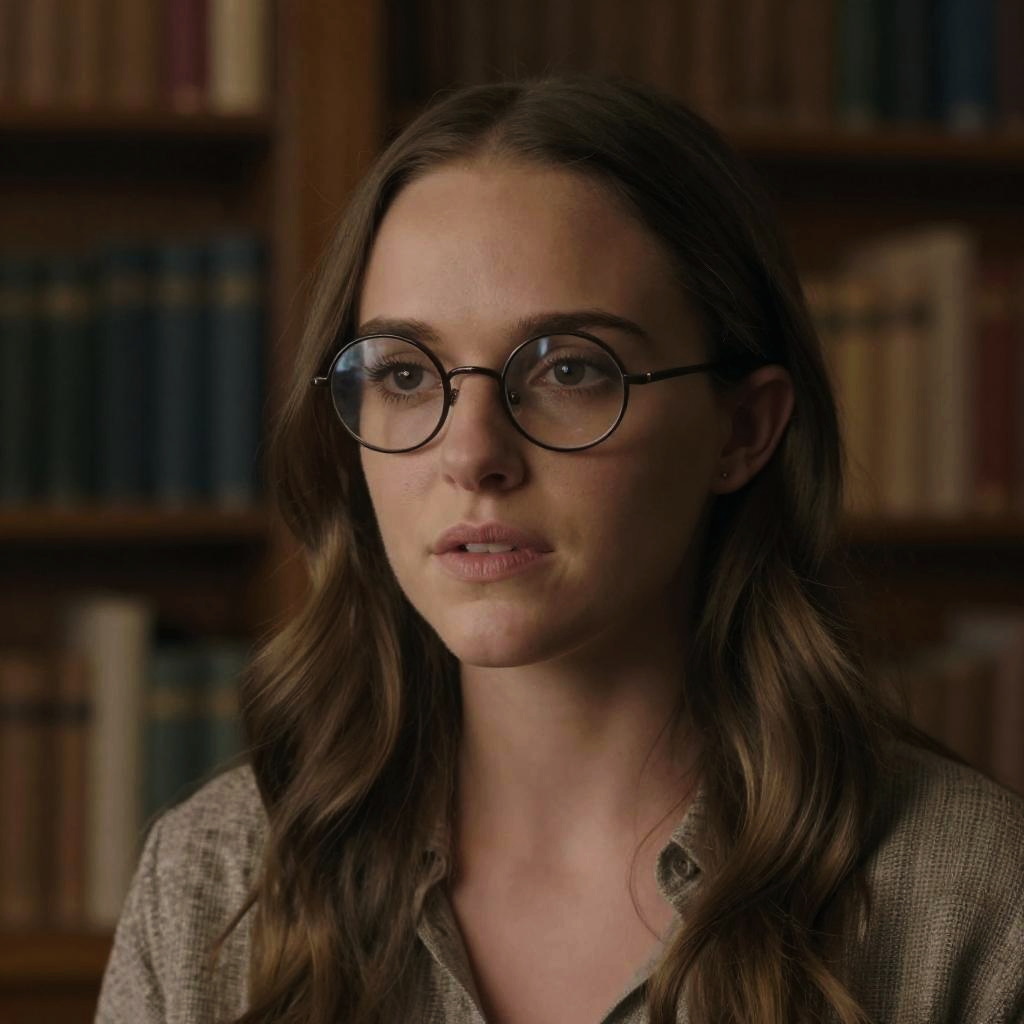 Natalie Portman glasses, vintage round spectacles, warm tones, cozy library scene, artistic photography style, soft focus, natural makeup, sophisticated atmosphere