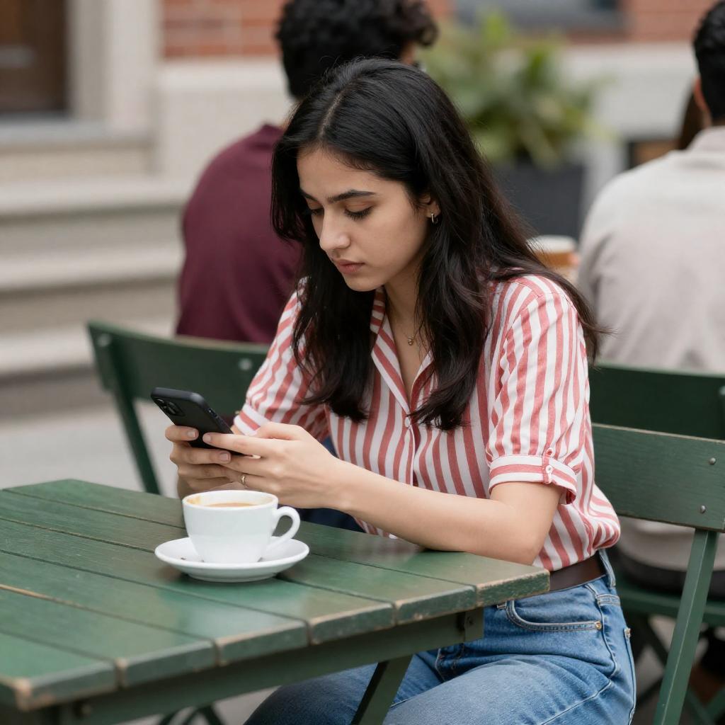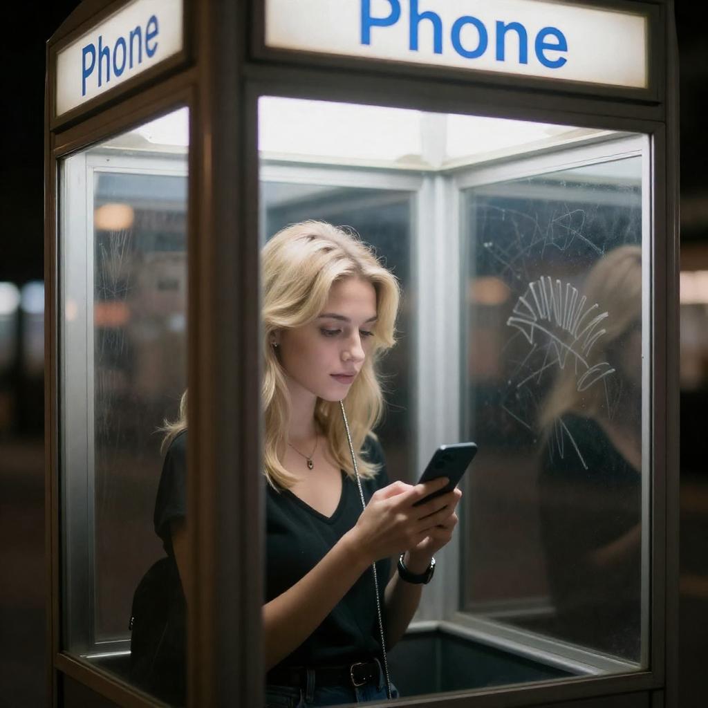 Photograph of a young woman with light brown skin and dark hair in a ponytail, wearing a plaid shirt, intently looking at a smartphone. She is illuminated by colorful, glowing lights in the background, creating a vibrant, almost surreal effect. Another person's arm is partially visible on the right.
