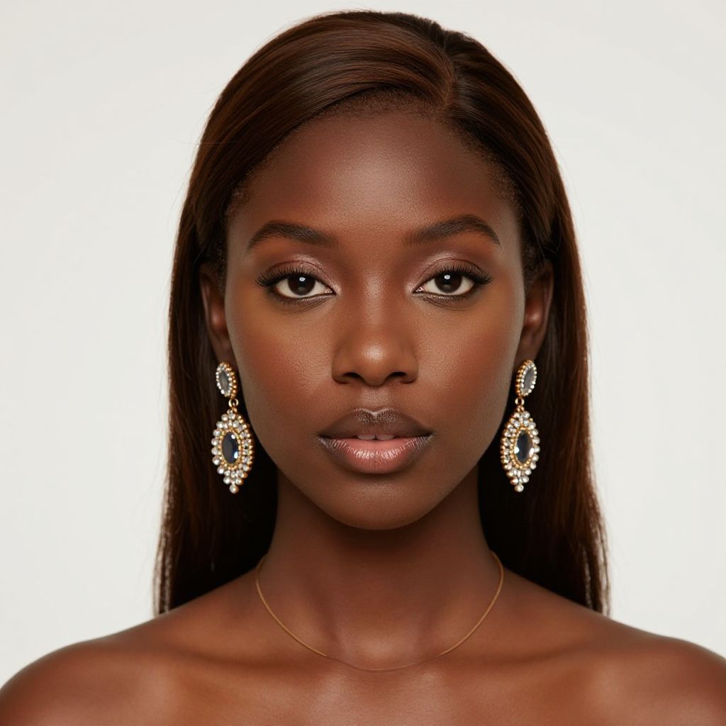 Photograph of a dark-skinned woman with straight, shoulder-length brown hair, staring directly at the camera. She has large, almond-shaped brown eyes, full lips with a subtle pink gloss, and a smooth complexion. She wears elegant, dangling diamond earrings with intricate designs and a thin gold necklace. The background is a plain white, making her features and accessories stand out prominently. Her expression is calm and confident. The image is sharply focused, highlighting the texture of her skin and the sparkle of the diamonds.