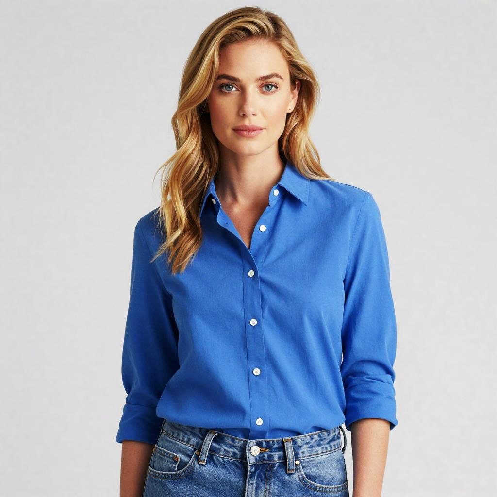 Casual Chic Style, blonde woman with blue eyes and a blue shirt looking at the camera