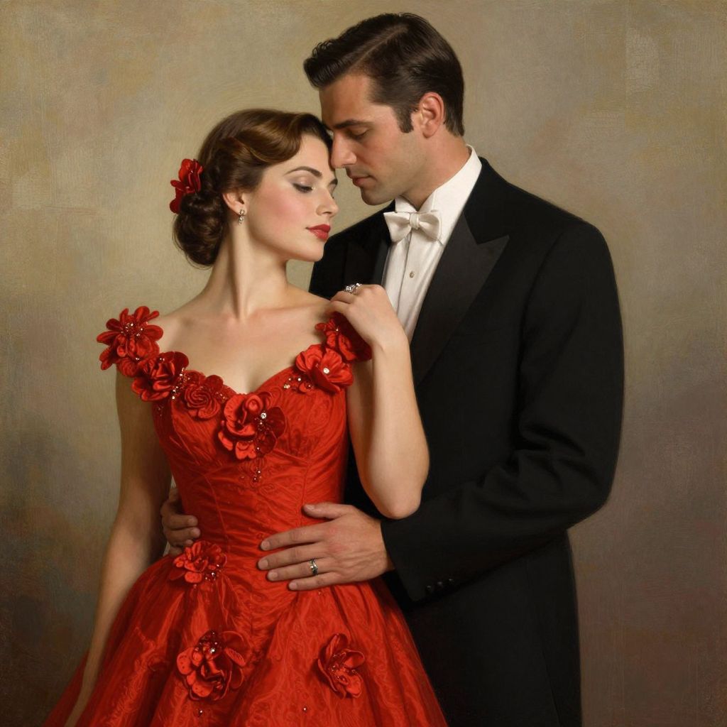 Photograph of a romantic couple in formal attire. The woman, with fair skin and red lipstick, wears an elegant, red, off-shoulder ball gown adorned with large, floral embellishments. Her brown hair is styled in an updo with a red flower accessory. The man, with fair skin and dark hair, wears a classic black tuxedo with a white shirt and black bow tie. He gently holds her waist while they gaze at each other. The background is a plain, muted beige. The image exudes a classic, romantic vibe with a focus on the couple's intimate connection.