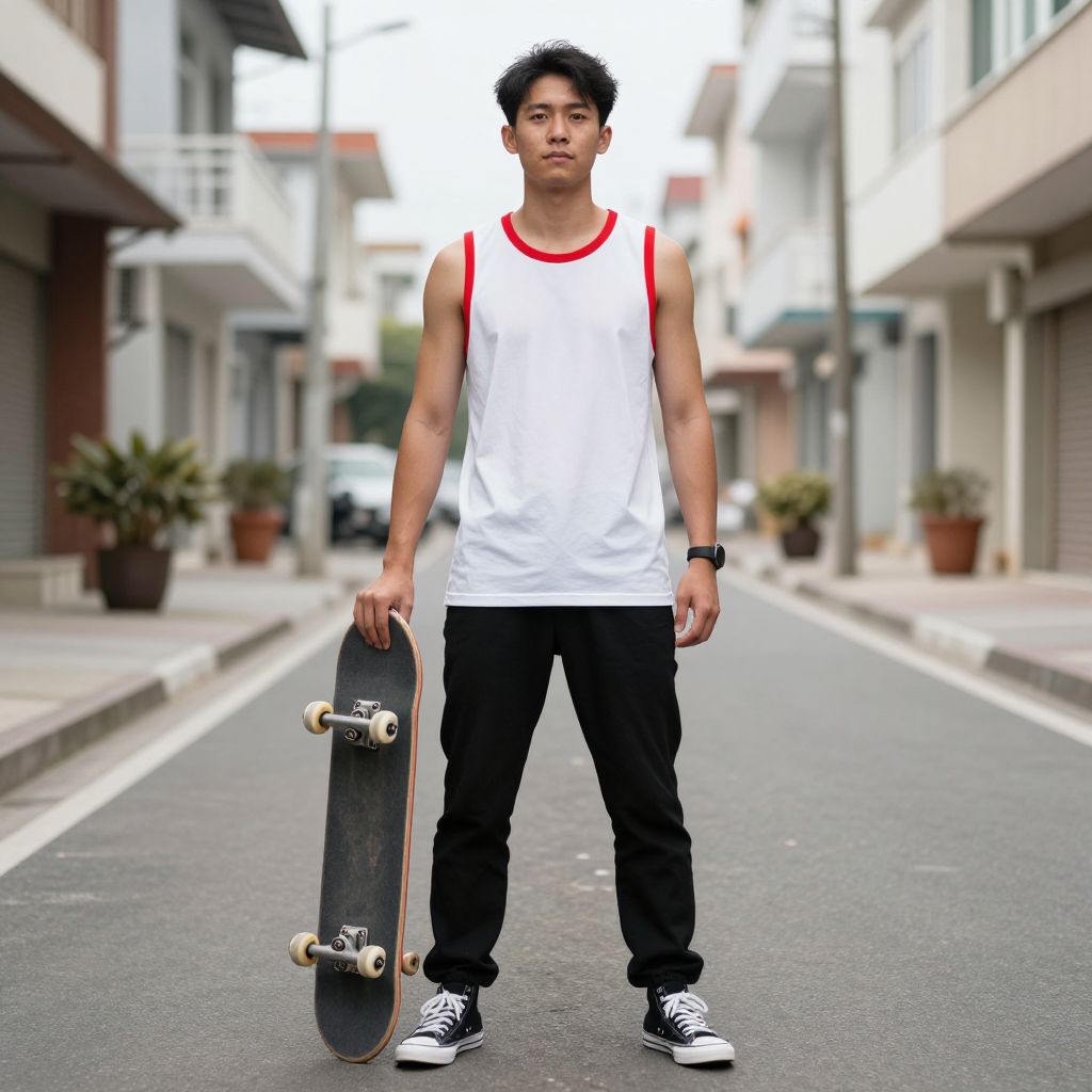 Young Asian man in white tank top with red trim, black pants, and sneakers, holding skateboard on urban street.