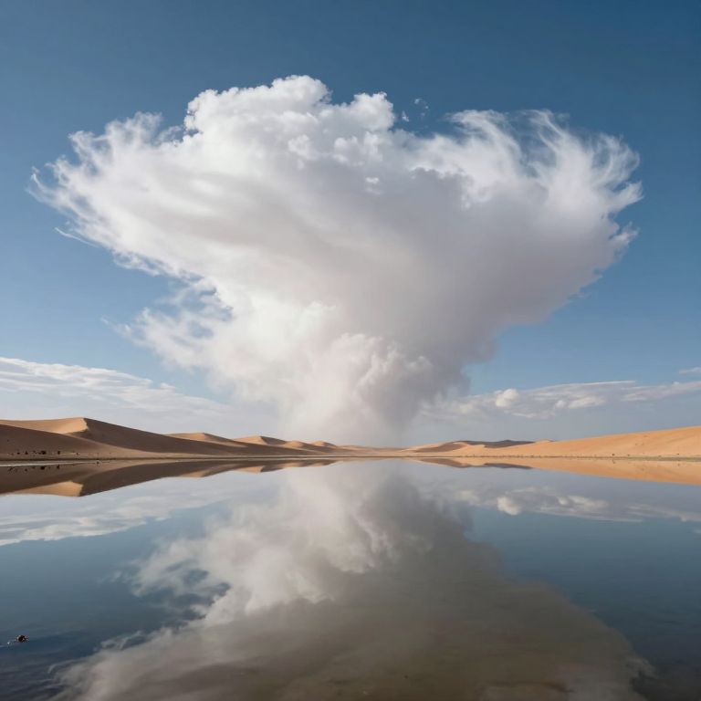 Photograph of a serene desert landscape featuring a large, billowing white cloud against a vivid blue sky. The cloud's reflection is perfectly mirrored in a still, glass-like body of water in the foreground. In the background, gentle, sandy dunes stretch across the horizon. The colors are vibrant, with the blue sky contrasting sharply with the white cloud and the golden-brown dunes. The overall composition is symmetrical and tranquil, capturing the beauty of natural elements.