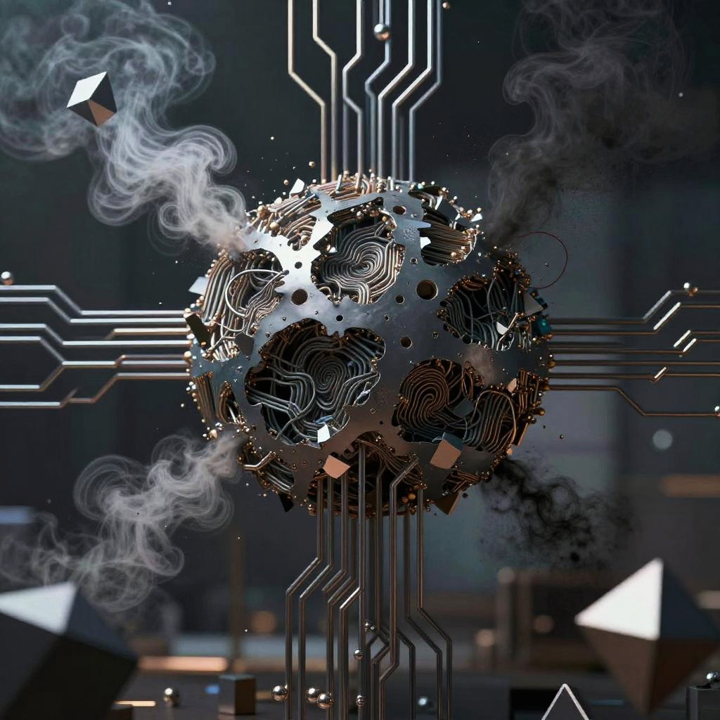 A digital 3D abstract representation of a corrupted neural network, featuring a spherical metallic structure with tangled circuits and fragmented geometry. Dark smoke emits from parts of the sphere, set against a blurred background with cold metallic hues, illustrating AI malfunction or data corruption.