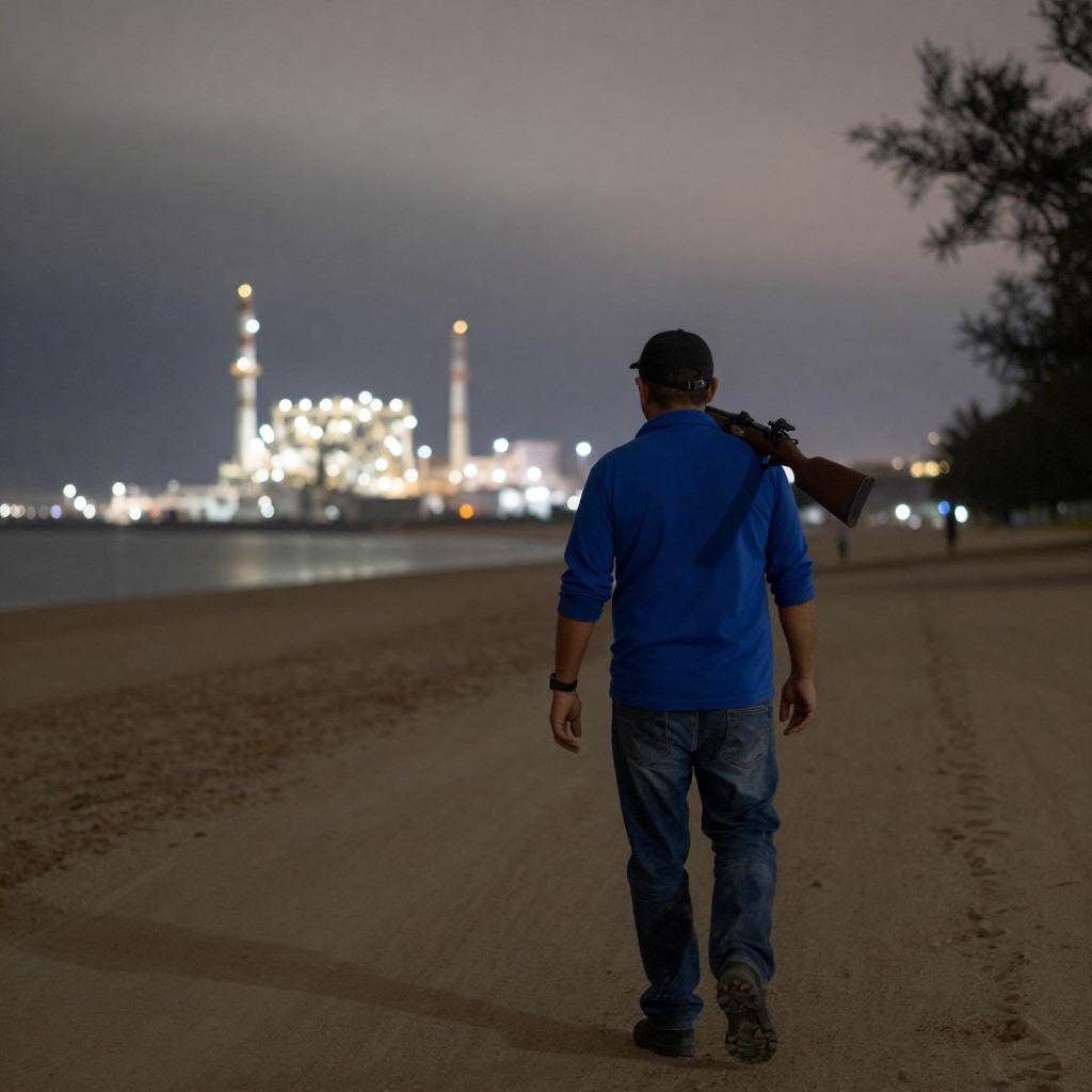 Photograph of a man walking on a sandy beach at night. He wears a blue shirt, jeans, and a black cap, carrying a rifle over his shoulder. Industrial complex with bright lights and cranes in the background. Overcast sky. Man's back to camera, looking at the horizon. Tree on the right edge.