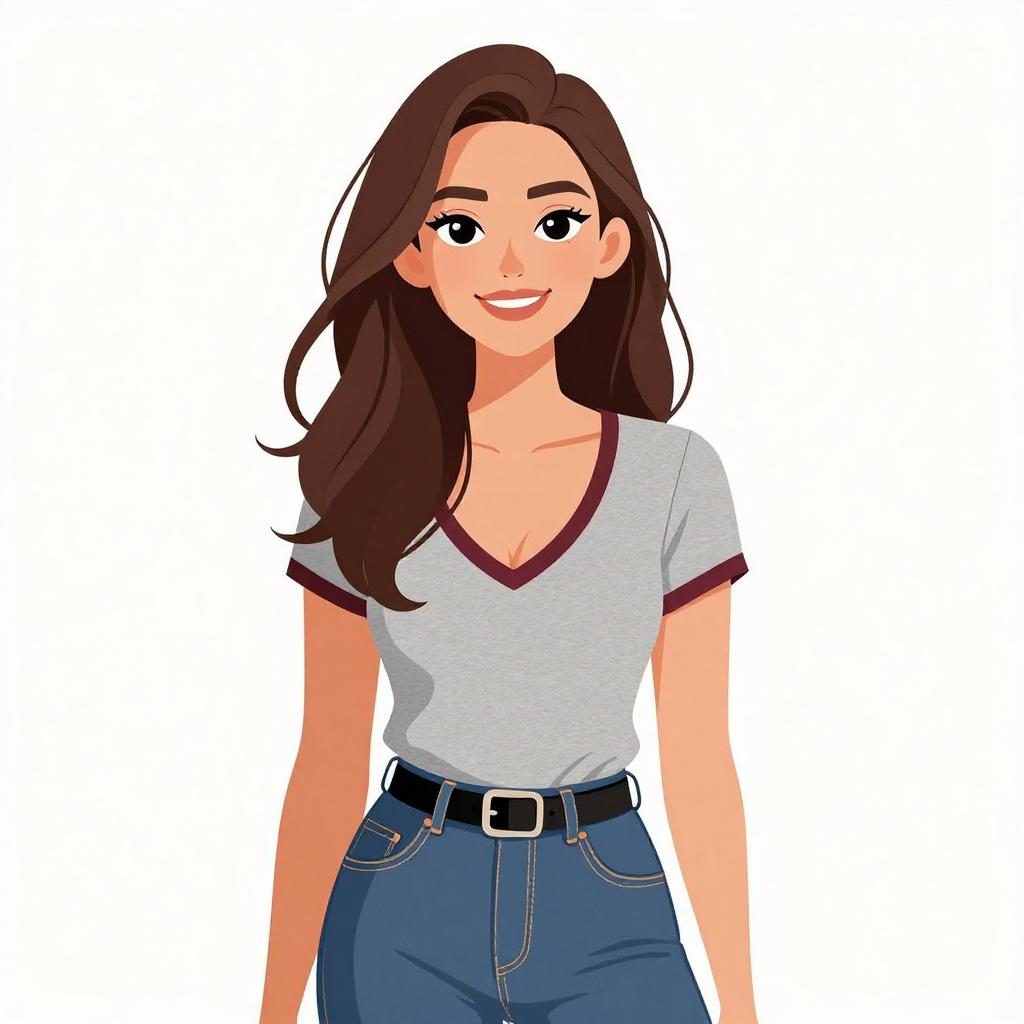 Woman with pretty face and pretty hair. smiling Woman, casual style, heather grey t-shirt with deep V-neckline and maroon trim, short sleeves, front tucked into blue high-waisted jeans, black leather belt with simple buckle, white background. --sref 1467