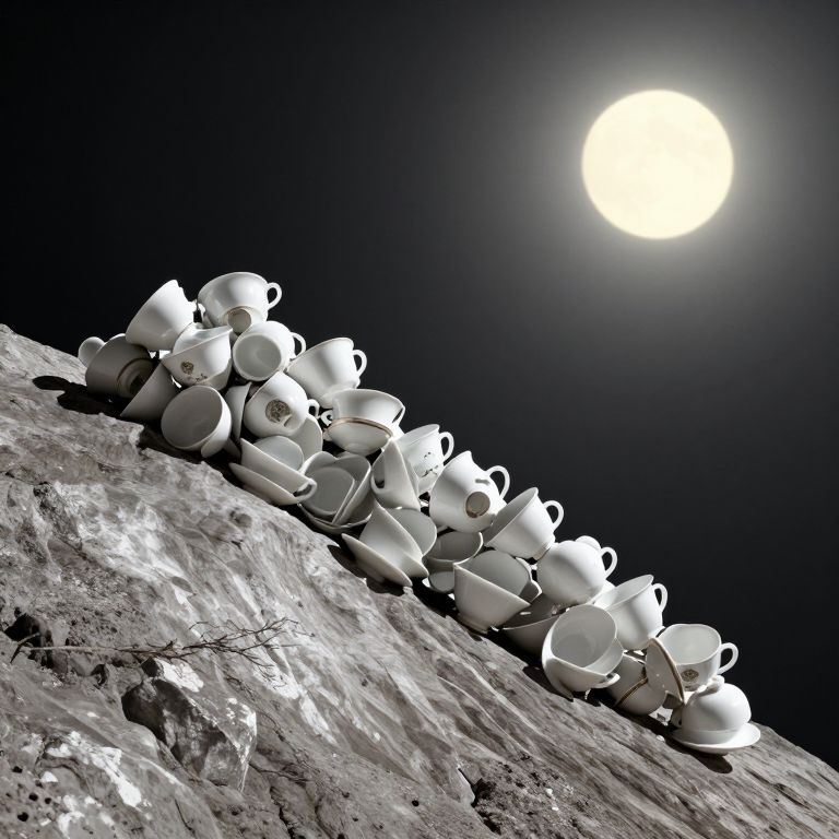 A surreal, black-and-white photograph depicts a large pile of white teacups and teapots stacked haphazardly on a rocky, uneven surface. The background features a stark, bright full moon in a dark, cloudless sky, casting a strong, luminous glow. The teacups and teapots are uniformly white, contrasting sharply with the dark rocks and the night sky. The image has a high-contrast, almost hyper-realistic style, emphasizing the textures of the rocky surface and the smooth, ceramic cups. The moon's light illuminates the scene, creating dramatic shadows and highlighting the teacups' rounded shapes.