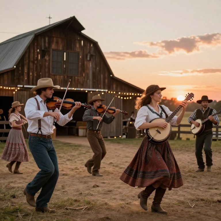Hoedown scene with lively dancers in rustic countryside setting, wooden barn decorated with string lights, vintage attire, fiddles and banjos playing, warm sunset sky, joyful expressions, dynamic movement, earthy tones and lively atmosphere