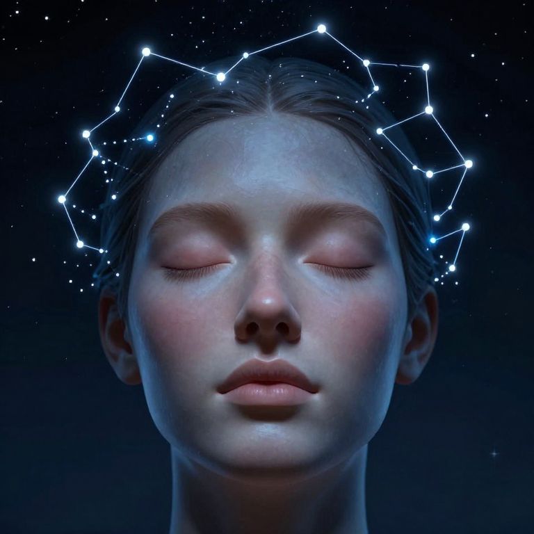 This is a digital artwork featuring a close-up of a young woman with closed eyes and a serene expression. She has fair skin with a subtle glow and smooth texture. Her brown hair is pulled back, and her face is illuminated by soft blue light. A constellation of bright white stars forms a geometric pattern around her head against a dark, star-speckled background. The stars are connected by thin white lines, creating a celestial halo effect. The overall composition evokes a sense of calm and cosmic connection.