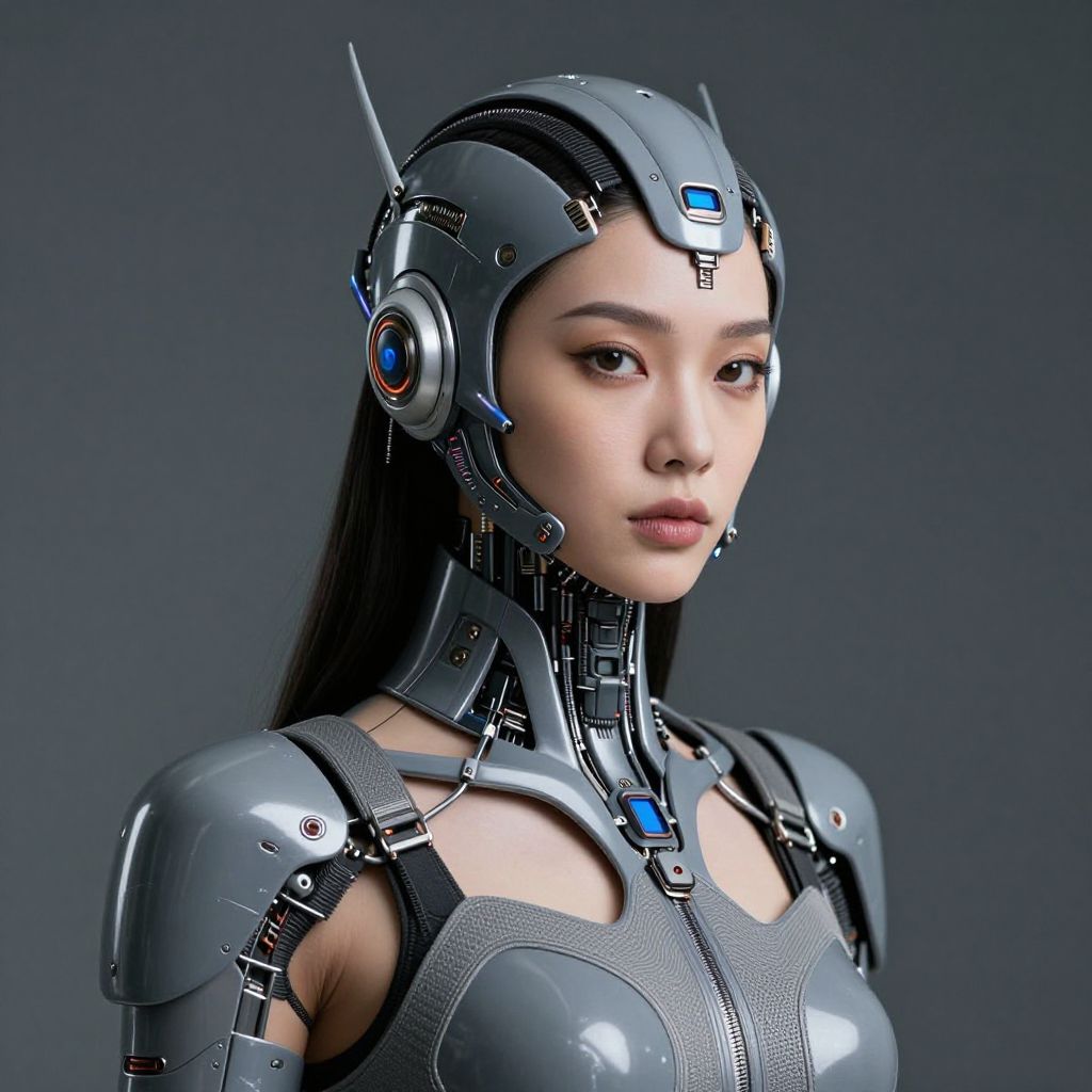 This is a highly detailed CGI image of an Asian woman with long black hair, wearing a futuristic, metallic gray robotic suit that covers her shoulders and chest. The suit features sleek, polished surfaces, blue LED lights, and intricate mechanical designs, including a helmet with ear-like protrusions and a central blue light. Her expression is calm and composed, with a slight smile. The background is a plain, dark gray, which highlights the subject. The overall style is realistic with a sci-fi aesthetic, emphasizing advanced technology and futuristic design.