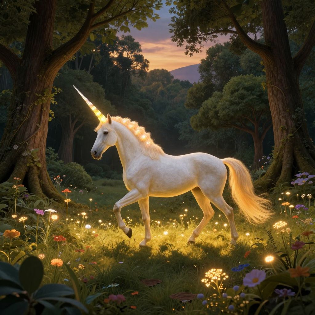 Imagine an enchanting landscape where a regal equine creature with an otherworldly horn stands at the threshold of a verdant woodland, its luminescent appendage casting mesmerizing hues in the play of golden sunlight. This captivating tableau, reminiscent of Dali's surrealistic realms and Potter's charming illustrations, celebrates the sublime elegance of nature through meticulous craftsmanship. From above, we witness this beguiling being as it elegantly crosses a radiant expanse of glowing flora, their gentle luminescence bathing the serene twilight in an ethereal embrace. The harmonious melding of dreamlike fantasy and lifelike realism beckons spectators to surrender themselves to a realm where the ordinary is surpassed by the extraordinary.