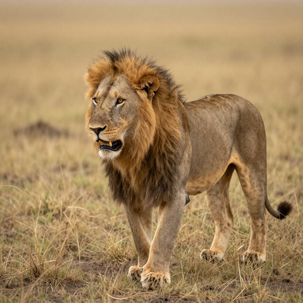 Photograph of a majestic male lion in profile, walking through a dry, grassy savanna. His thick, dark brown mane contrasts with his light tan fur. The lion's focused eyes and slightly open mouth suggest determination. The background is a blurred mix of yellow and brown grasses, giving a sense of motion. The image captures the lion's powerful presence and natural habitat.