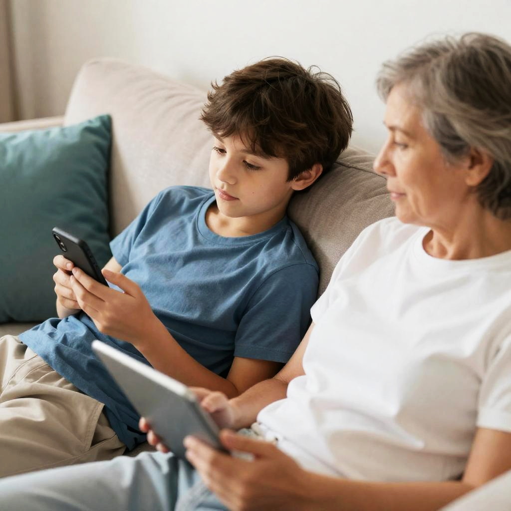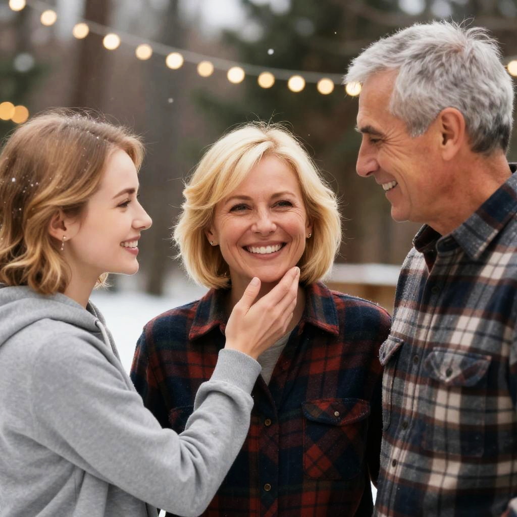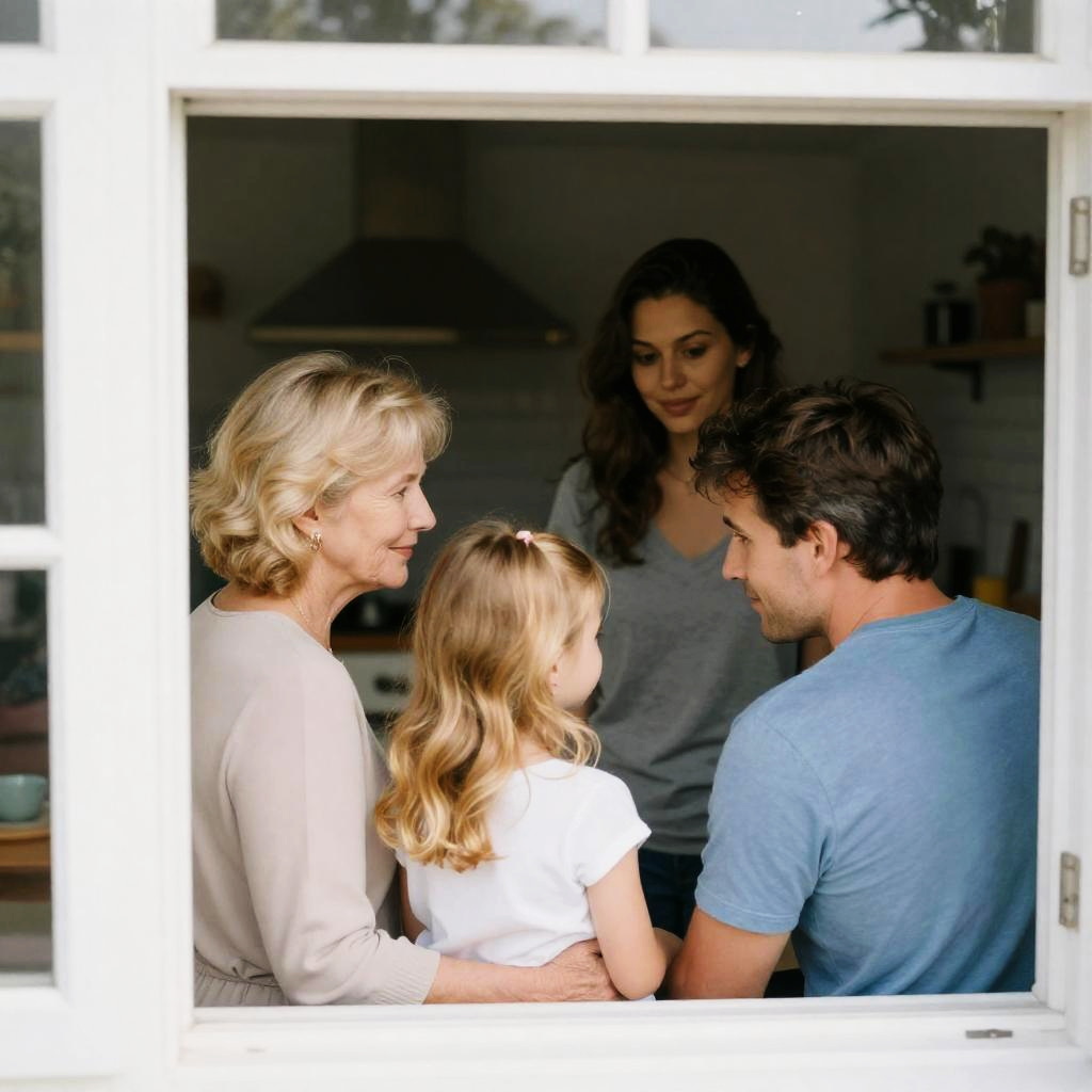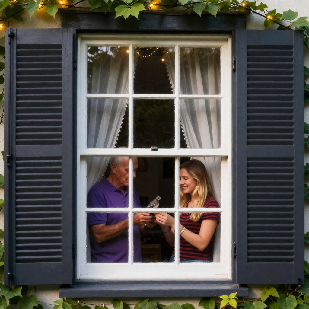 Photograph of a window with dark shutters, green foliage, and string lights in the foreground. Inside, a bald older man in a purple shirt and a young woman with blonde hair in a red and black striped shirt hold a small bird. They are standing close, facing each other, with the woman smiling and the man looking down. The window is divided into six panes. Curtains are tied back, and fairy lights are visible above.