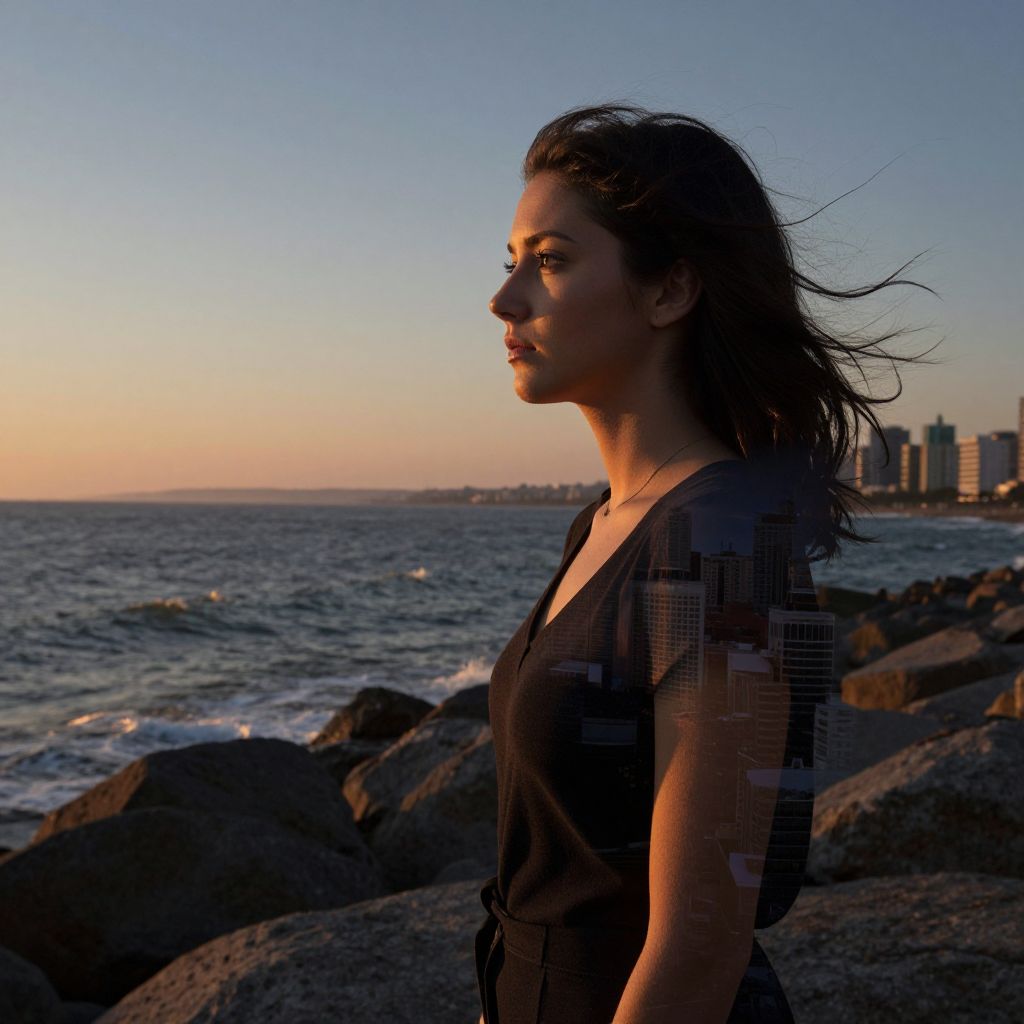 A young woman, her dark hair flowing like stormy waves, stands on a rocky shore at sunset. Her gaze, filled with introspection and determination, fixes upon a distant horizon veiled by a soft double exposure of sprawling cityscapes—a hint at the movement and possibilities that lie ahead. The setting sun bathes her face in warmth while casting long shadows that intertwine with the urban textures overlaying her form, creating an intriguing contrast between hard edges and smooth transitions. This portrait captures the captivating juxtaposition of nature's peace and the vibrancy of city life, reflecting the inner turmoil and dreams of the subject. Deep hues and saturated colors enhance both the tranquility of the coastal scene and the energy of the urban landscape, resulting in a deeply personal yet universally relatable image.