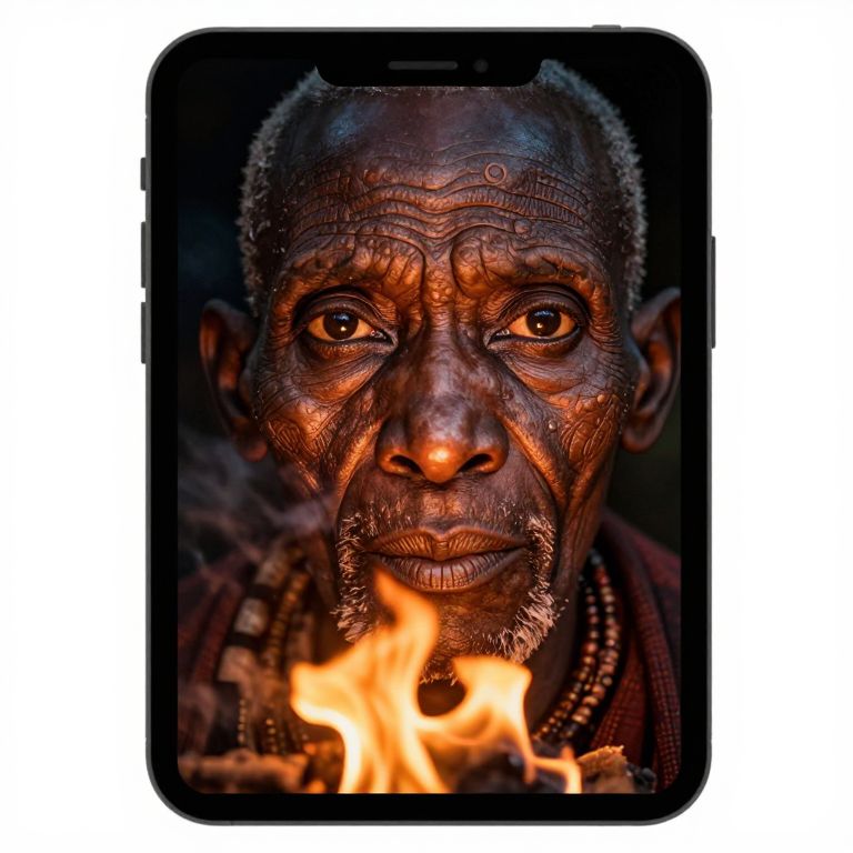 Envision an iPhone portrait of an African tribal elder's enigmatic gaze, his deep eyes full of wisdom and experience, reflected in the warm glow from a crackling fire. The bronze tones of his wrinkled skin, illuminated by the flames, highlight intricate patterns etched by life's journey. Shot from a low angle, this atmospheric perspective emphasizes the unique texture of his aged face against the contrasting shadows cast behind him, evoking deep respect and contemplation.