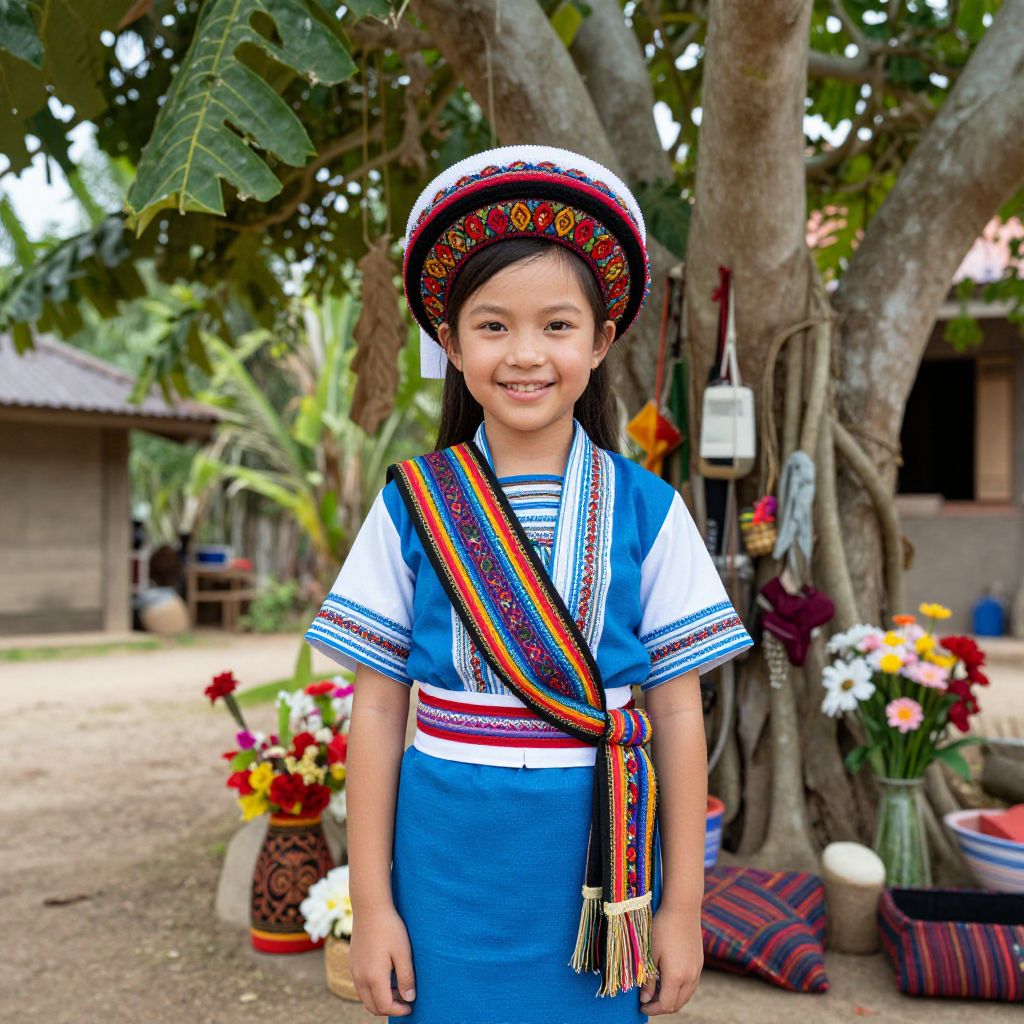 A high-resolution photo of a young girl in a traditional Filipino costume, wearing a blue and white sarong with a colorful embroidered sash and a hand-embroidered kantil hat, standing under a flowering banyan tree in a rural community, her face bright and joyful with a slight smile, surrounded by native flowers and traditional artifacts.