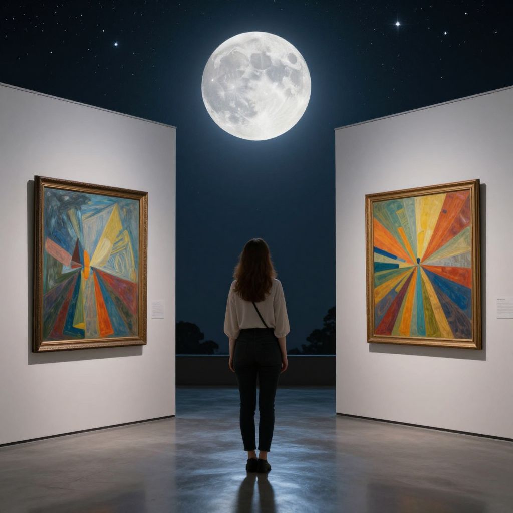 Woman stands contemplative in a gallery room, framed by two vibrant paintings, gazing at a luminous full moon that dominates the starry night sky above a reflective, moonlit floor.