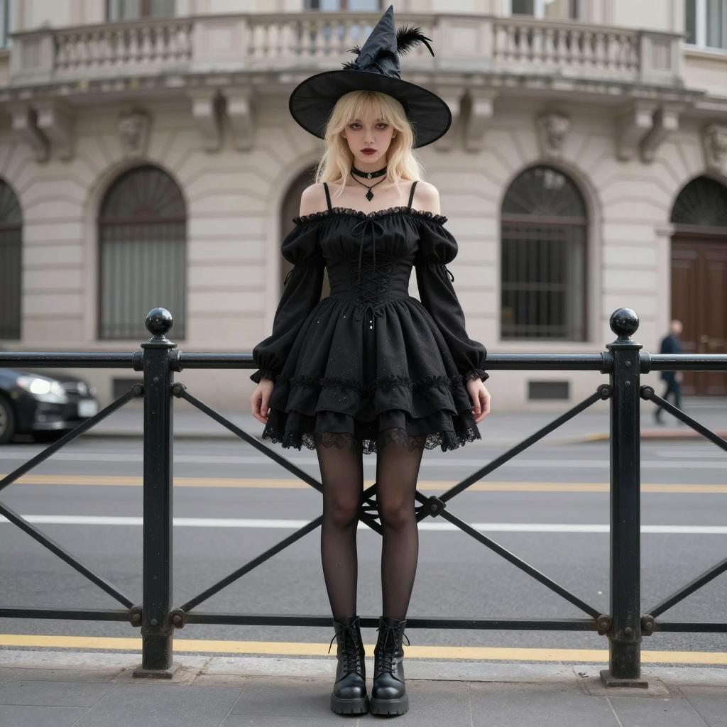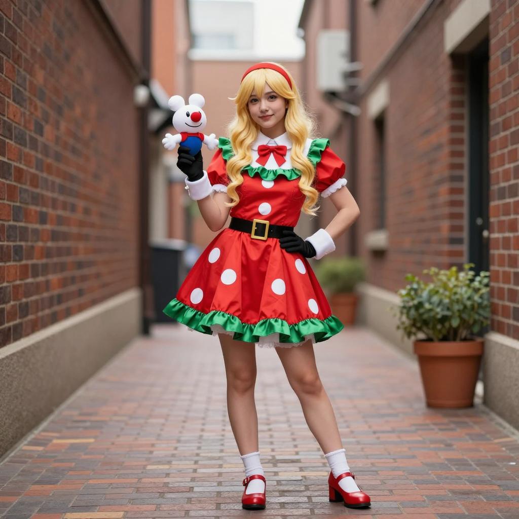 Full body photograph of an Asian woman with a black bob haircut wearing a red and black costume. The outfit features long red sleeves, a black bodice with red heart prints, a white skirt with red and black polka dots, red boots, and a red headpiece with small horns. She is standing against a plain beige wall in daylight in a casual pose.