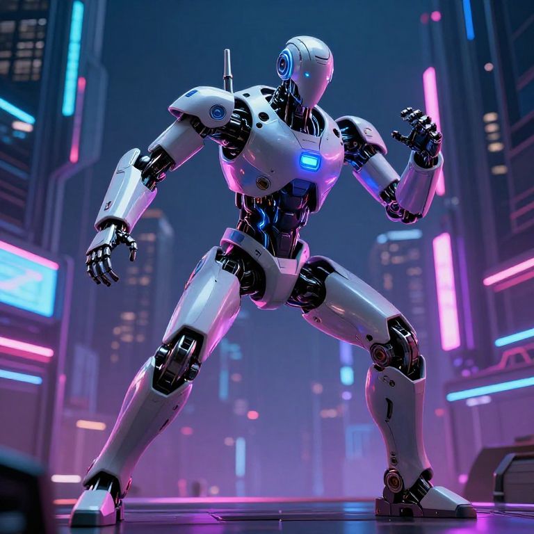 ControlNet pose of a futuristic humanoid robot standing in dynamic action stance, illuminated by neon lights in a cyberpunk cityscape, detailed mechanical joints and glowing control circuits, high-tech atmosphere, cinematic lighting, ultra-detailed digital art.