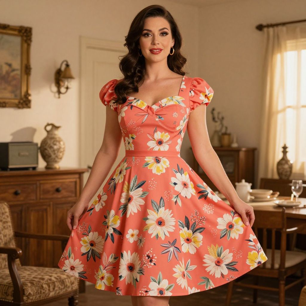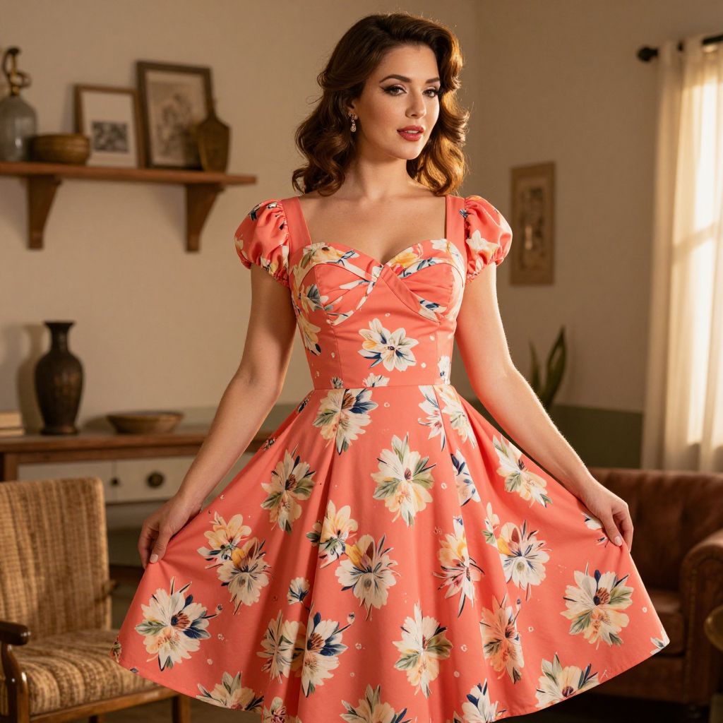 A woman elegantly poses in a vibrant coral floral dress featuring a sweetheart neckline and puff sleeves, embodying a retro 1950s rockabilly aesthetic with a vintage charm, set against a cozy interior with warm golden-hour lighting and rustic decor.
