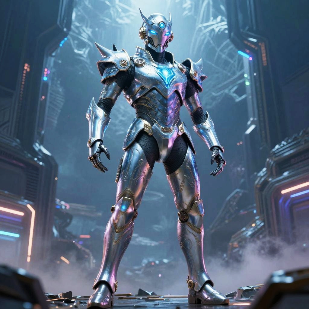 Armoru warrior in shining futuristic armor, standing in a misty battlefield at dawn, intricate blue and silver plating, glowing energy lines, dynamic pose, cinematic lighting, high detail, sci-fi fantasy style.
