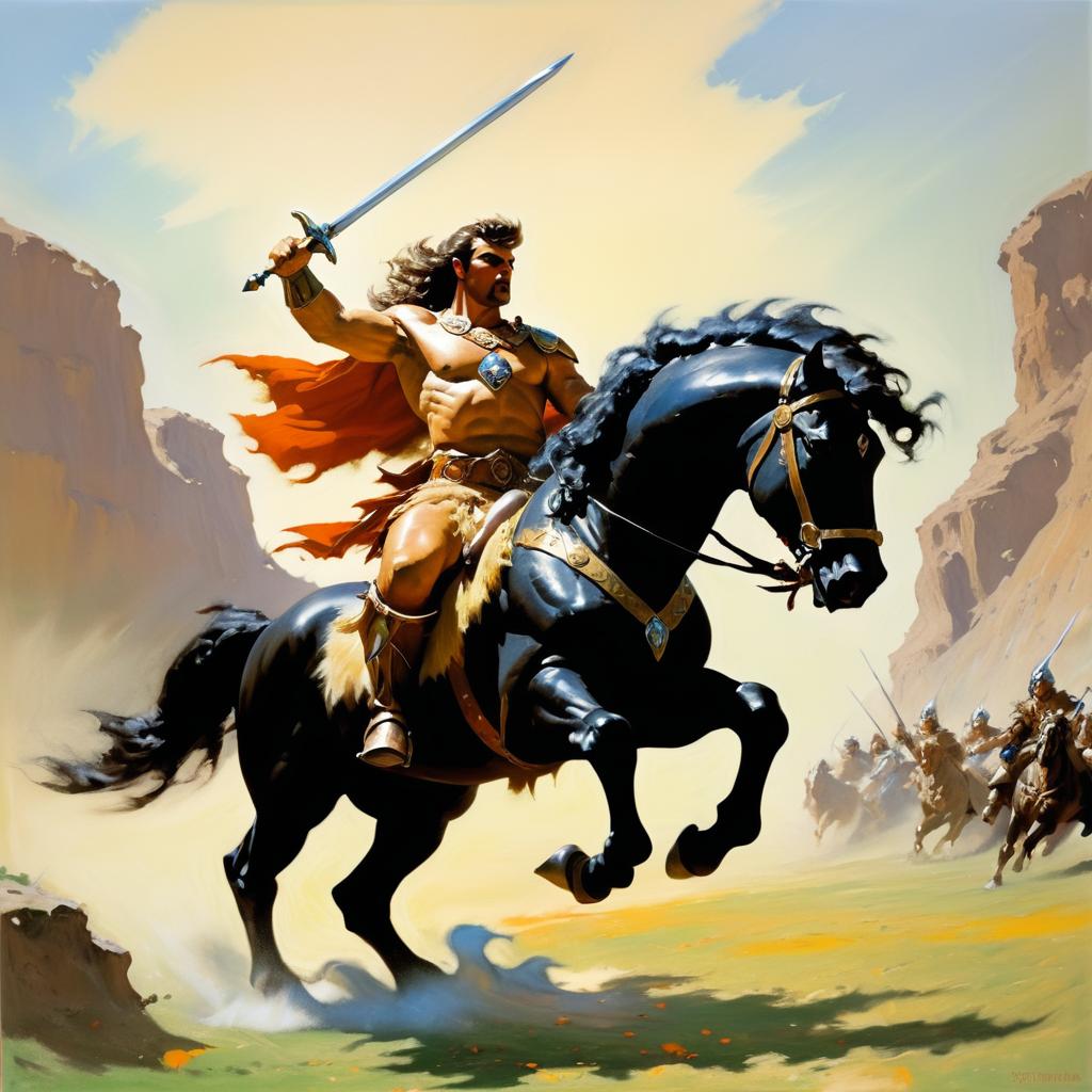 Oil painting of a noble centaur warrior charging through a battle, by Frank Frazetta, fantasy style.