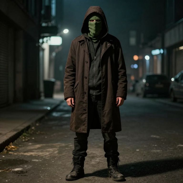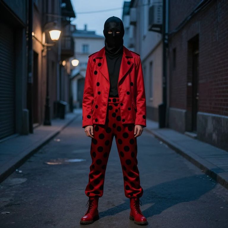 A person is wearing a red outfit with black polka dots, featuring a sleek red jacket, black polka-dotted pants, and red boots, standing in a dimly lit urban alley at dusk. The person wears a dark, featureless black mask that covers their face, giving them a mysterious and enigmatic appearance. The atmosphere is cool and shadowy, with soft streetlights casting long shadows. The overall mood is dramatic and atmospheric, blending elements of fantasy and realism.