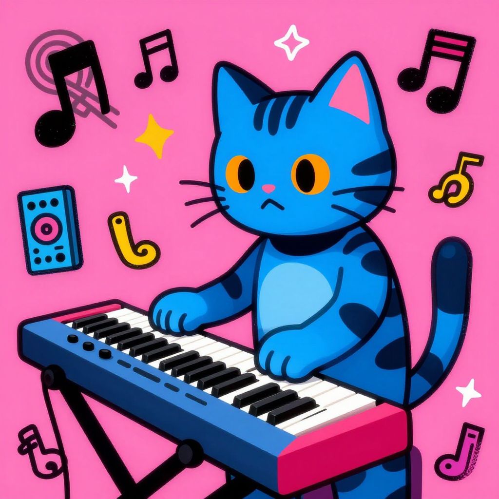 Digital illustration of a blue, black-striped cat with large yellow eyes playing a colorful keyboard on a pink background, surrounded by musical notes and a speaker.