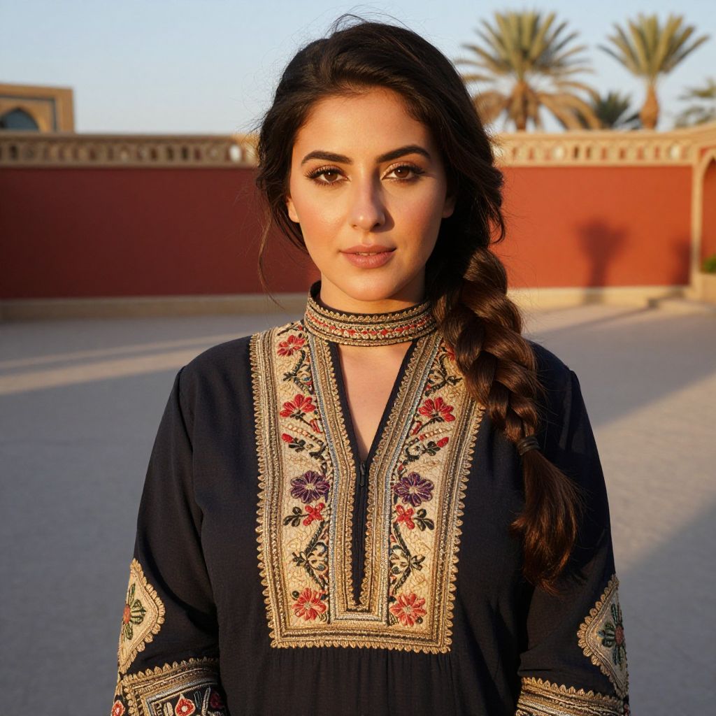 A realistic photo of a woman in her late 20s with warm brown eyes, full dark brown hair in a loose braid, and a natural, sun-kissed complexion wearing an authentic Afghan salwar suit with a high collar and embroidered cotton panels, standing in a traditional courtyard in Kabul during golden hour, with a red border wall in the background and palm trees in the distance, soft sunlight casting long shadows.. The woman has big breasts and cute face