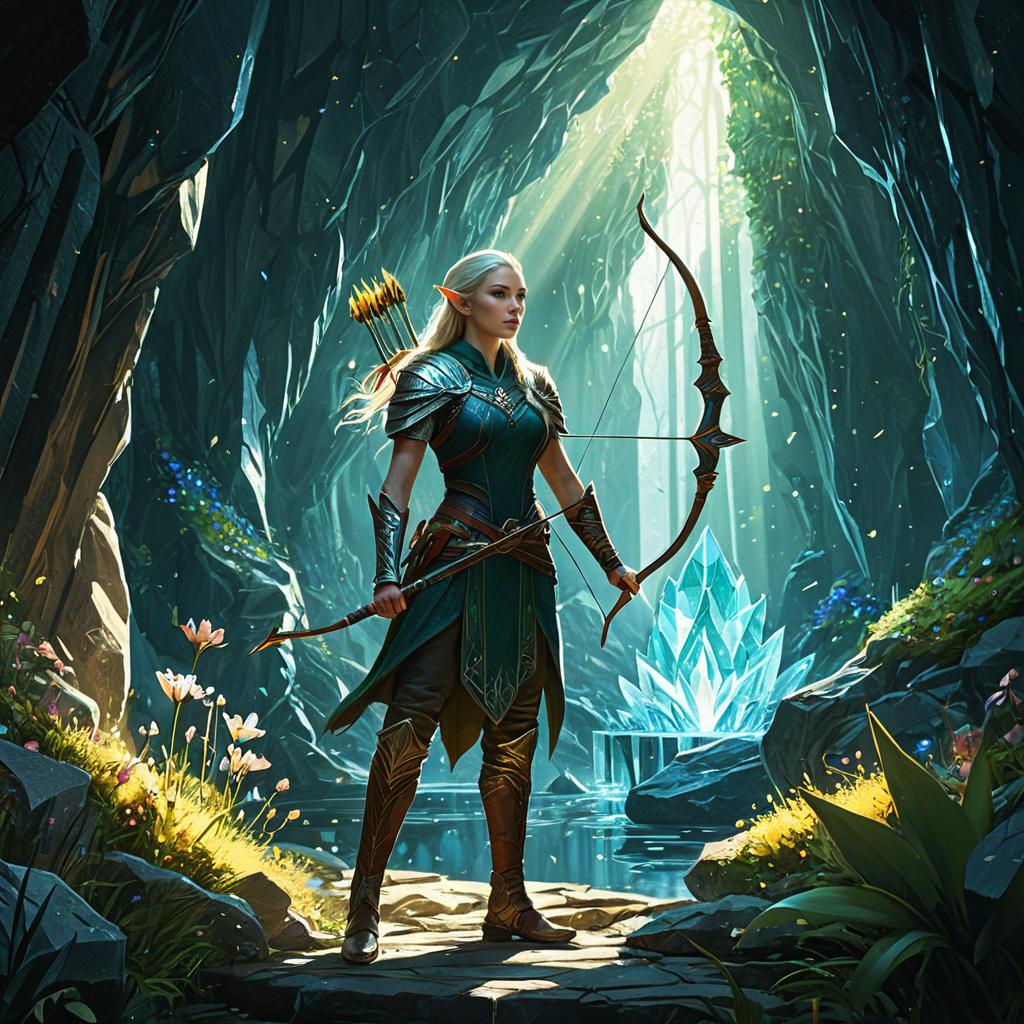 A detailed digital painting of an elven warrior princess standing amidst the ruins of an ancient castle at dawn. The character is dressed in intricate green and gold armor with long blonde hair and pointed ears, holding a sword. The scene features cinematic lighting highlighting the worn stone pillars and broken architecture, with a sharp focus and smooth illustration style influenced by artists Loish and Craig Mullins.