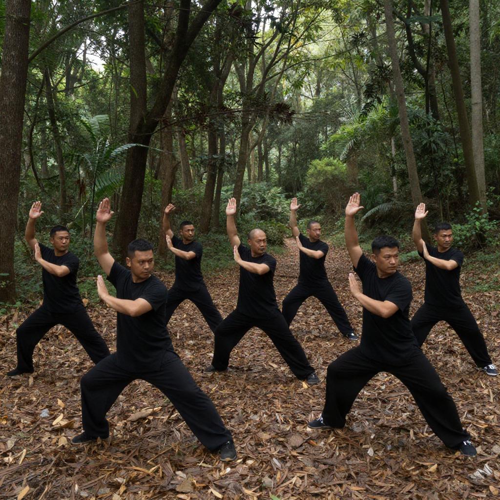 Photograph of eight men in a forest, dressed in black clothing, performing martial arts stances with hands raised. Leaf-covered ground, tall trees with green foliage. Men in various dynamic poses, focused expressions. Sunlight filtering through trees.