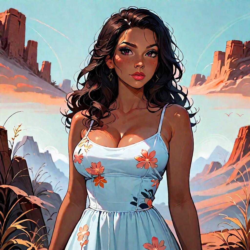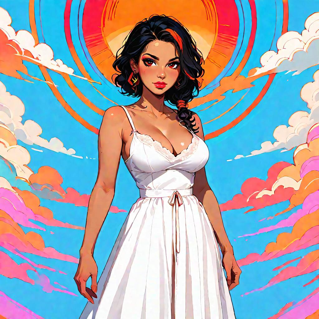 Illustration of an olive-skinned woman with dark hair accented in purple, wearing a form-fitting white spaghetti strap dress with a tie waist. She poses confidently with one hand on her waist against a vibrant desert backdrop with layered pastel mountains and colorful abstract elements in sunset hues.